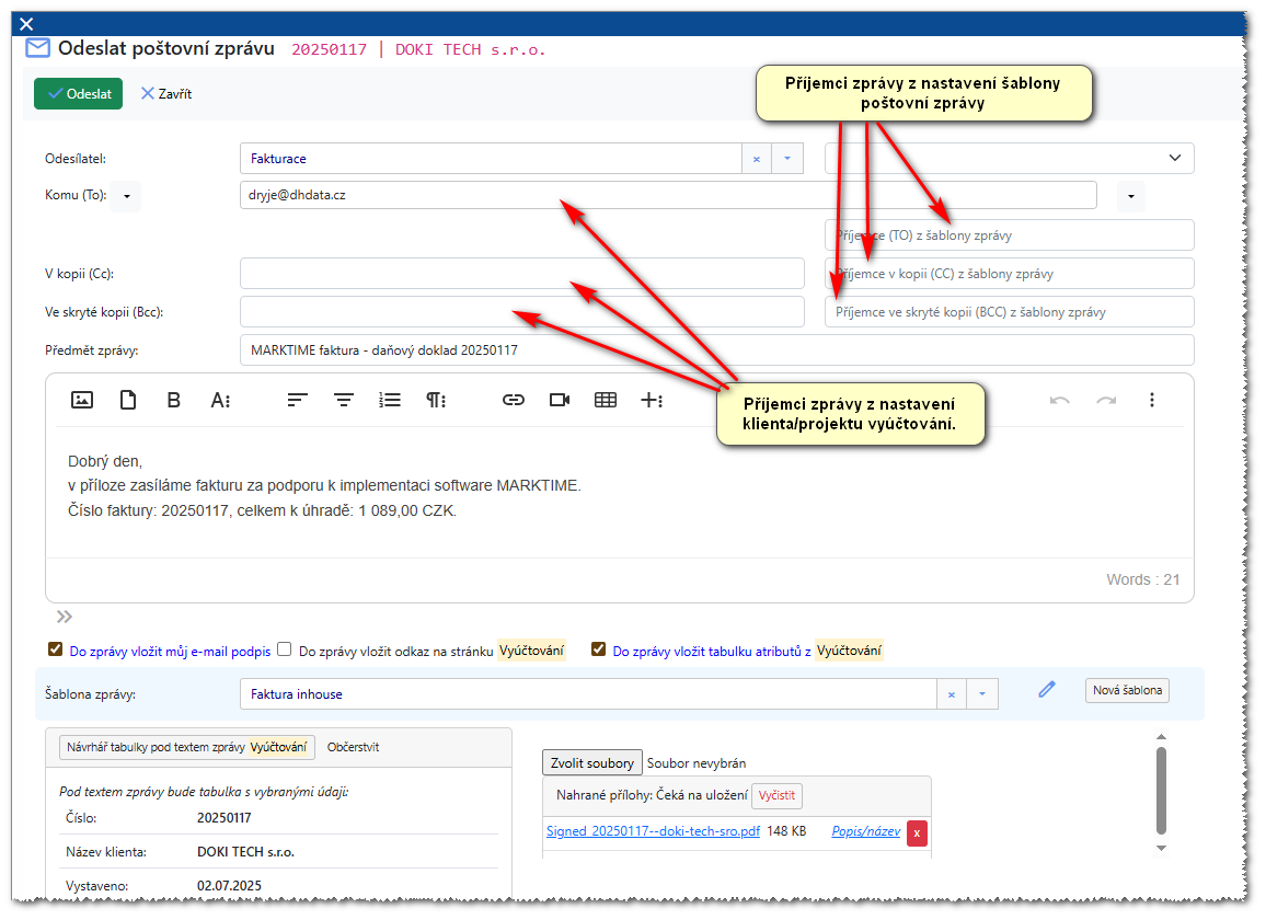 Rozšířili jsme okno pro odeslání poštovní zprávy o pole příjemců zprávy z nastavení e-mail šablony.