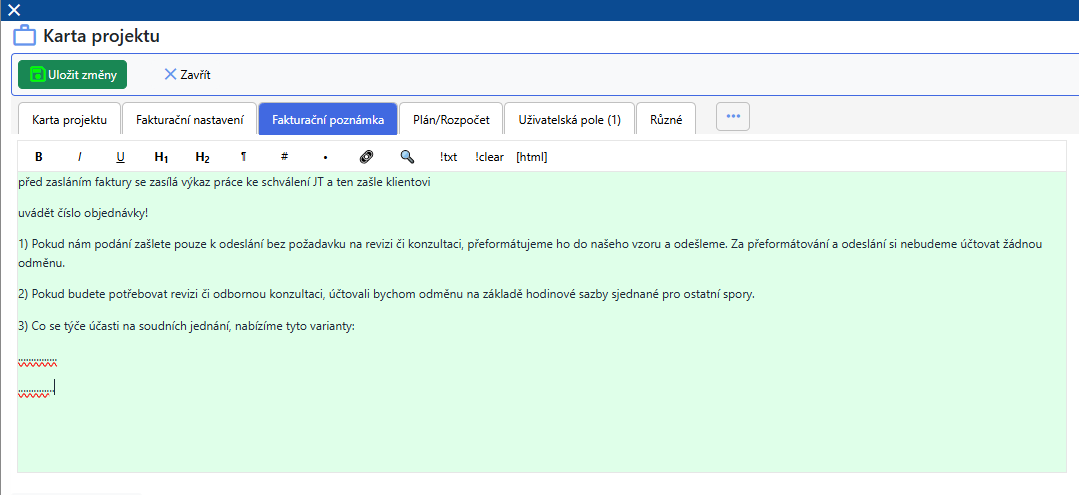 V kartě projektu a v kartě klienta projektu (kontaktu) je možné zapisovat tzv. "Fakturační poznámku".