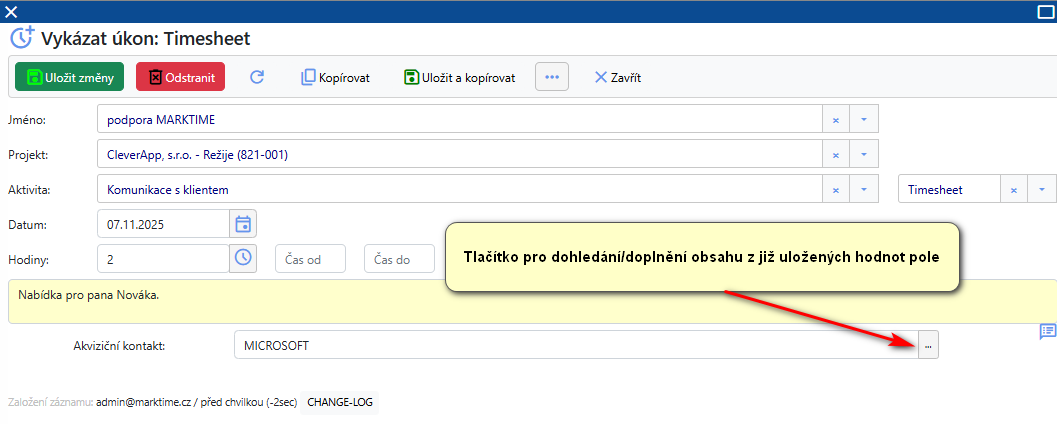 Cílem tlačítka je zobrazení nabídky všech uložených hodnot daného pole a mít možnost z nabídky vybrat hodnotu pole.