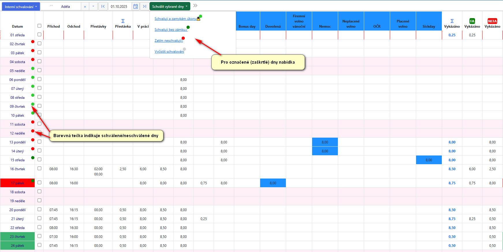 Vizualizace schválených dnů je dostupná také v rozhraní DAYLINE.